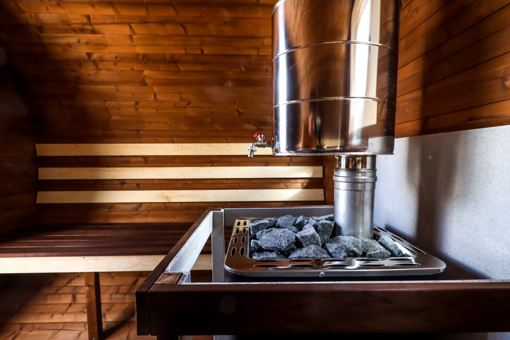 - Skamet wood stove with stones, water boiler, protective fence and chimney,